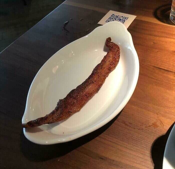 You might believe that the bacon doesn’t look small in the picture, but that’s incorrect. The camera was held close to the dish, making it appear larger than it actually is. This illustrates why sides should be ordered carefully in restaurants. A high price doesn’t always mean a generous portion.