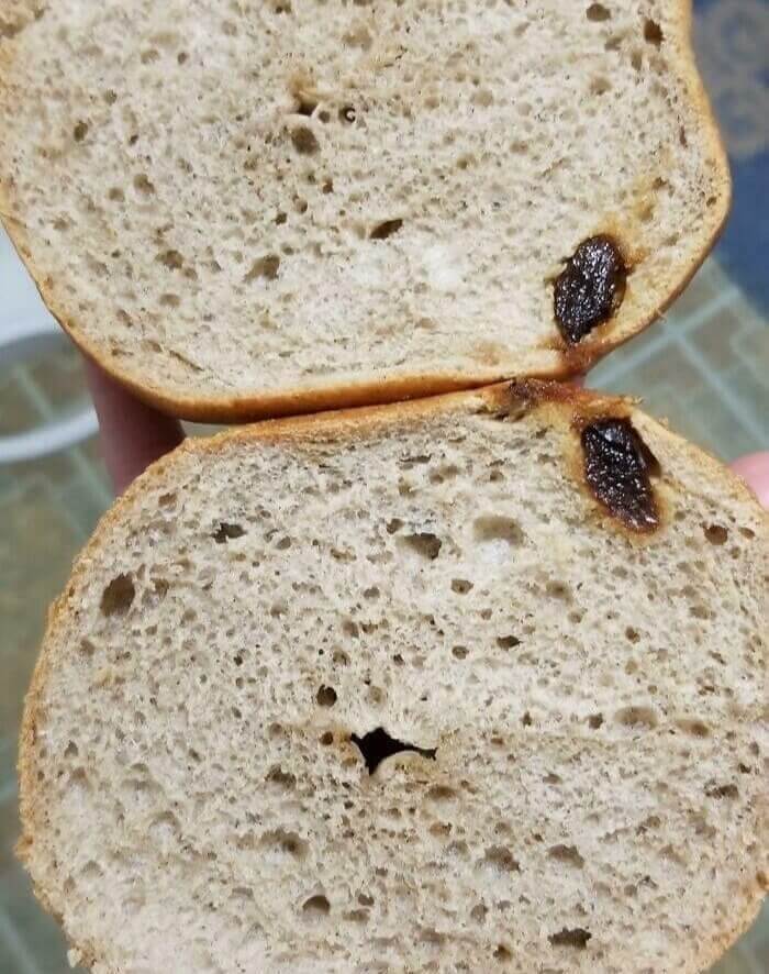 Cinnamon bagels are generally plain and do not contain extra ingredients. However, this particular product deviated from the standard recipe and contained two raisins. The person who opened the bagel was surprised and momentarily thought they had bought a raisin bagel. Typically, this wouldn’t be a big issue since the raisins can be removed.