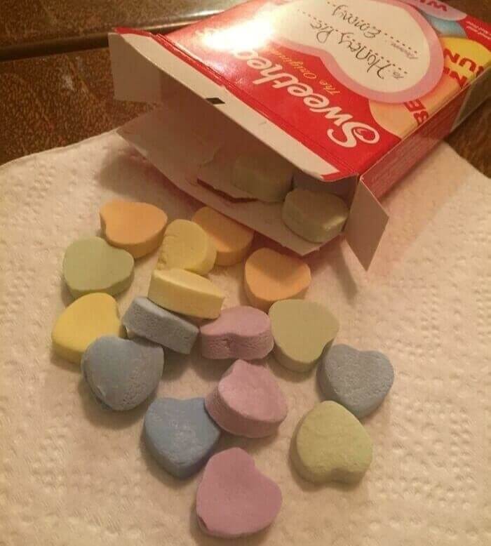 The conversation hearts were meant to have romantic messages on them. As you can see, they have no writing. Moreover, some of the hearts are poorly shaped. This is why you shouldn’t buy a gift without first seeing it. At least the guy found the humor in it and shared the image online.