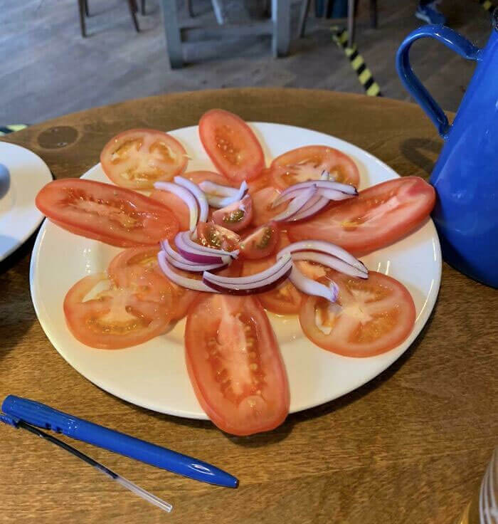 Maintaining a healthy lifestyle can be expensive, as salads often come with a high price tag. It is also frustrating when you order one and receive just tomatoes with a few onions. The customer ordered a tomato salad for $5. It seems the restaurant didn’t consider carefully before adding this dish to the menu.