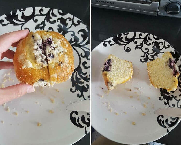 However, when the muffin was cut in half, it became evident that there were no blueberries inside. The pastry was also missing cream, which disappointed the purchaser. This is why you should never purchase something just because it looks attractive.