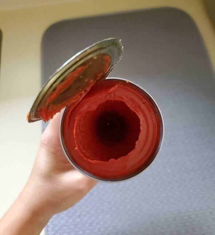 If the tomato paste had been filled from the center, the consumer could have used it for a longer time. Unfortunately, they ended up with a piece of tin. The only thing we’re left wondering is how the hole might have been created. If the company did it intentionally, then we hope they are sued for it.