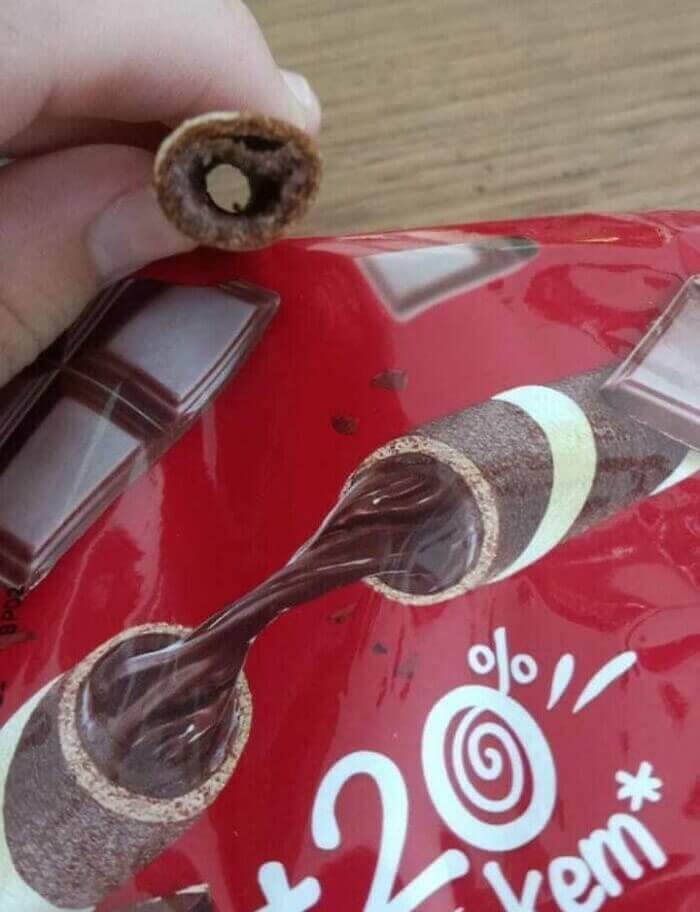 Here is another example of excessive packaging that has misled many people over the years. The wafer roll on the packet appears to be overflowing with melted chocolate. However, in reality, it is dry and does not contain as much. In fact, the actual wafer rolls have some hollow space through the middle.